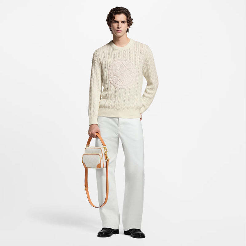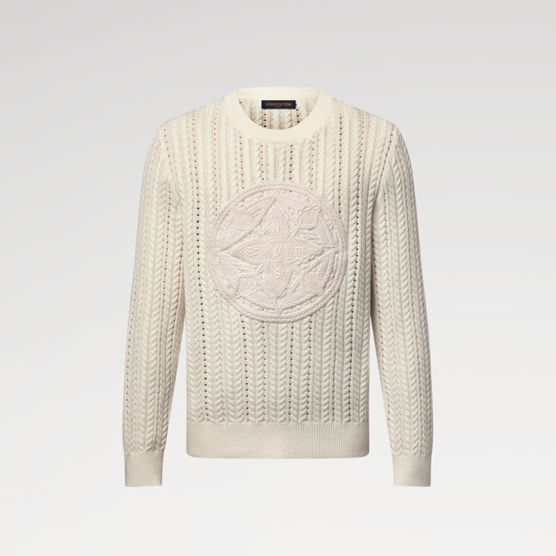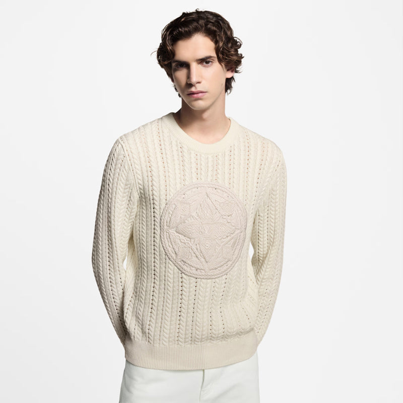 このロングスリーブ クルーネックセーターは、リラックス感のあるコットンウール混紡ケーブルニット素材を使用し、コレクションのマリンテーマを軽やかで通気性に優れたシルエットで表現しています。フロントのLVコンパス刺繍アップリケには、LVロゴとモノグラムフラワーがあしらわれ、カジュアルなルックに洗練された雰囲気を添えています。