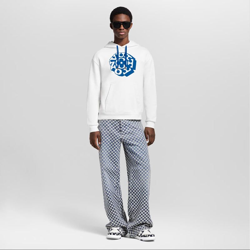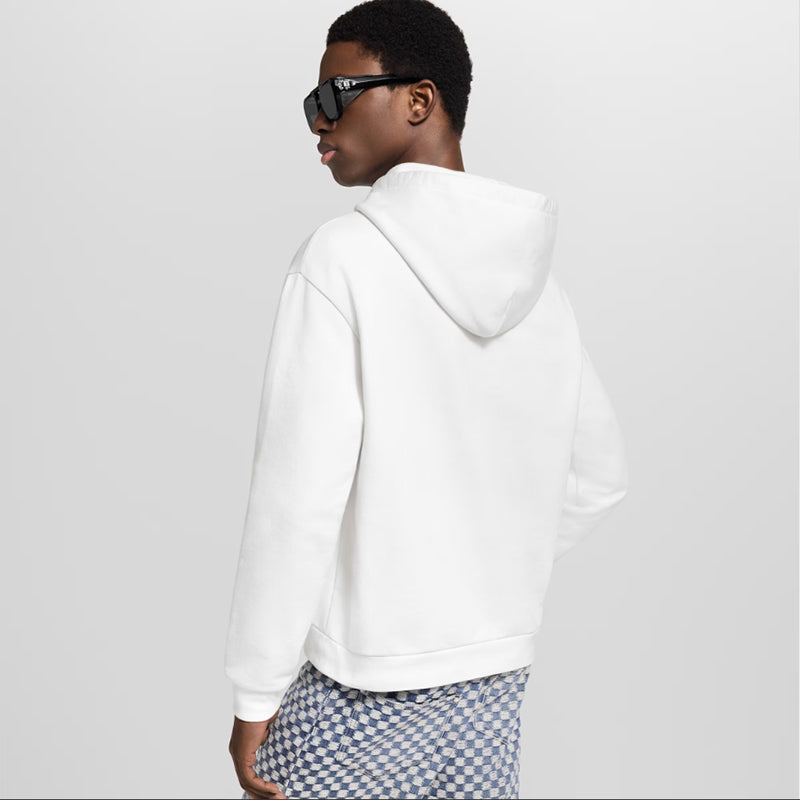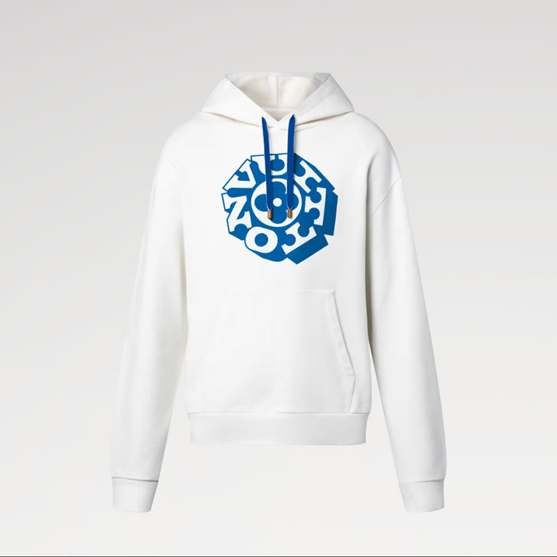 毎日の装いをグラフィカルなシグネチャーアクセントで彩る、軽やかで夏らしいオーガニックコットンジャージーのフーディ。ミルキーホワイトのベースに、2025秋冬ファッションショーに登場したヴィトン・フラワー モチーフをコントラストカラーのブルーで胸元にあしらいました。同じく鮮やかなブルーで配したフーディのコードを、ヴィンテージ風ゴールドカラーのメタル製エンドチップが飾ります。