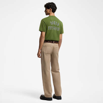 • オーガニックコットンを使用したグラフィクなショートスリーブのクルーネック。グラスグリーンの地色に、ブラック & ホワイトのインターシャ(象嵌細工)で表現したゴールデンレトリバーが躍動する姿があしらわれています。太文字で描いたメゾンのシグネチャーが胸元と背面に彩りを添える、愛犬家必見の遊び心溢れるデザインに仕上げました。普段の装いにグラフィカルなひねりを加える1着です。