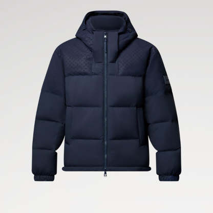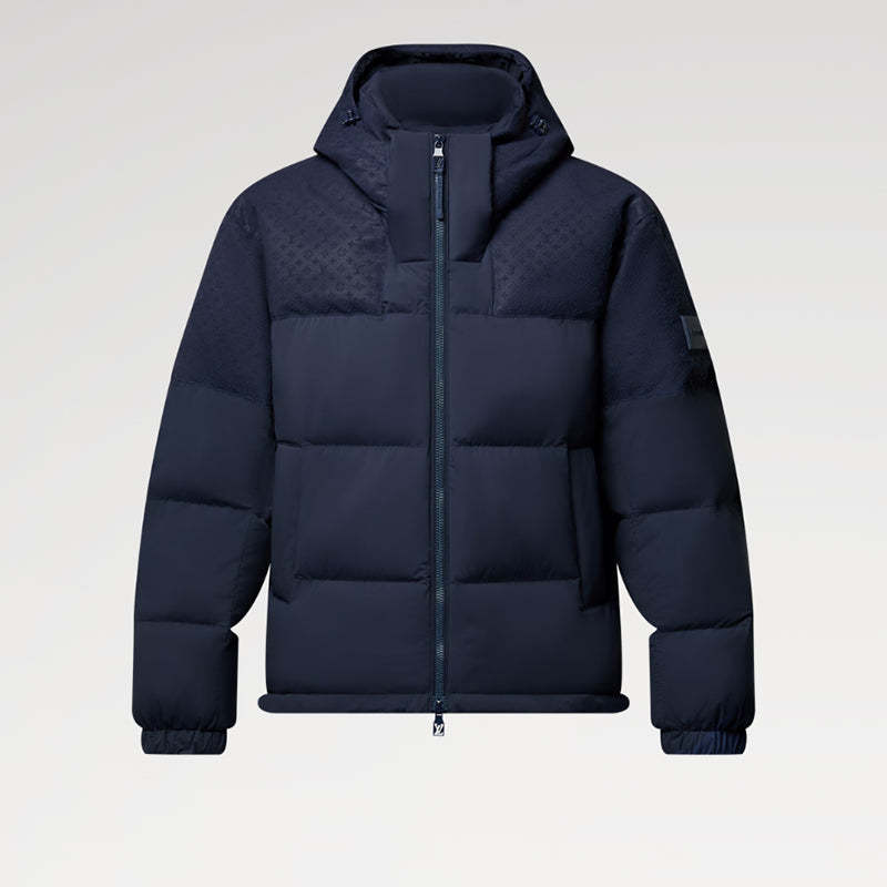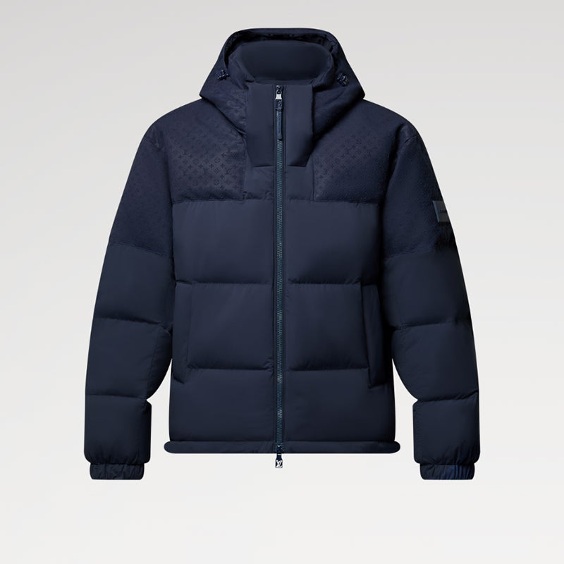 • このベルト付きジャケットは、異なる素材をブレンドして仕立てられ、ミニモノグラムのエンボス加工が施されたリップストップヨーク、取り外し可能な一体型フード、袖口のシリコンパッチが特徴です。エコダウン©の中綿ライニングは、軽量ながらも保温性と断熱性を提供し、サステナブルで倫理的なデザイン哲学を反映しています。