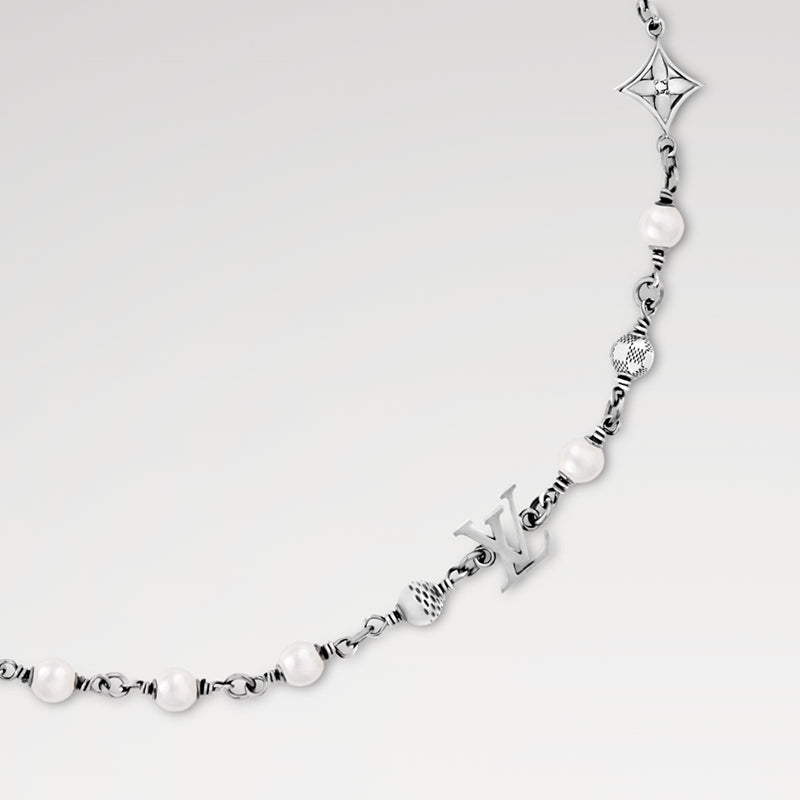贅沢な素材が目を引く雰囲気のある「ネックレス・LV パール」。メタルパールとメゾンのシグネチャー・チャームをチェーンに配し、1つ1つのパーツにダミエ・パターンを刻印したアイテムです。意外性のあるディテールを楽しむ真のルイ・ヴィトン愛好家にふさわしいスタイル。