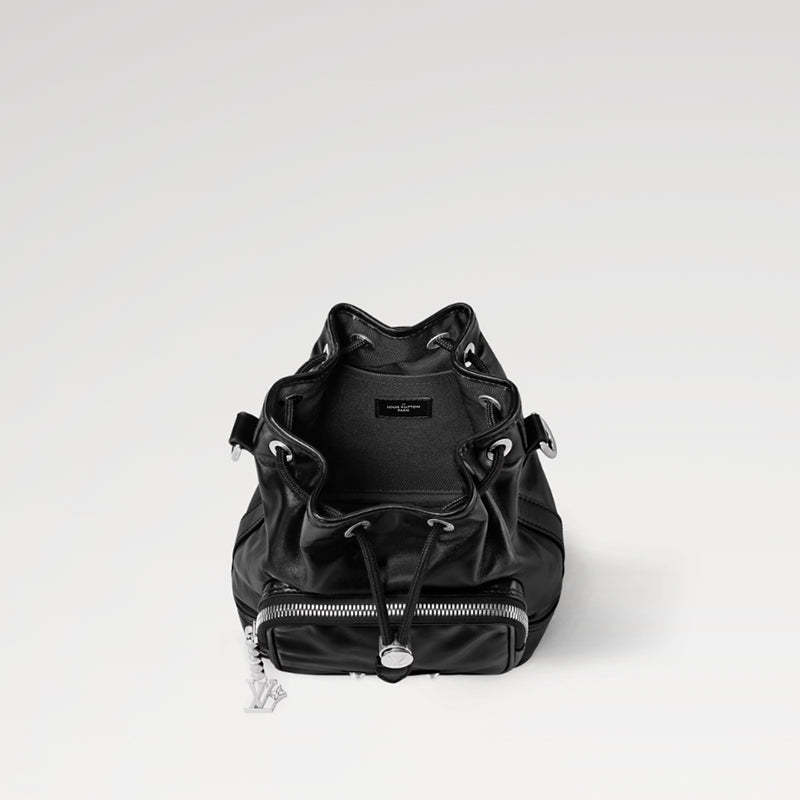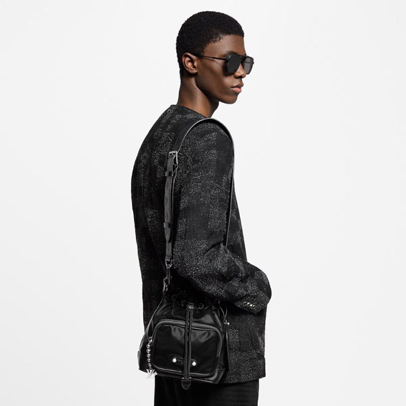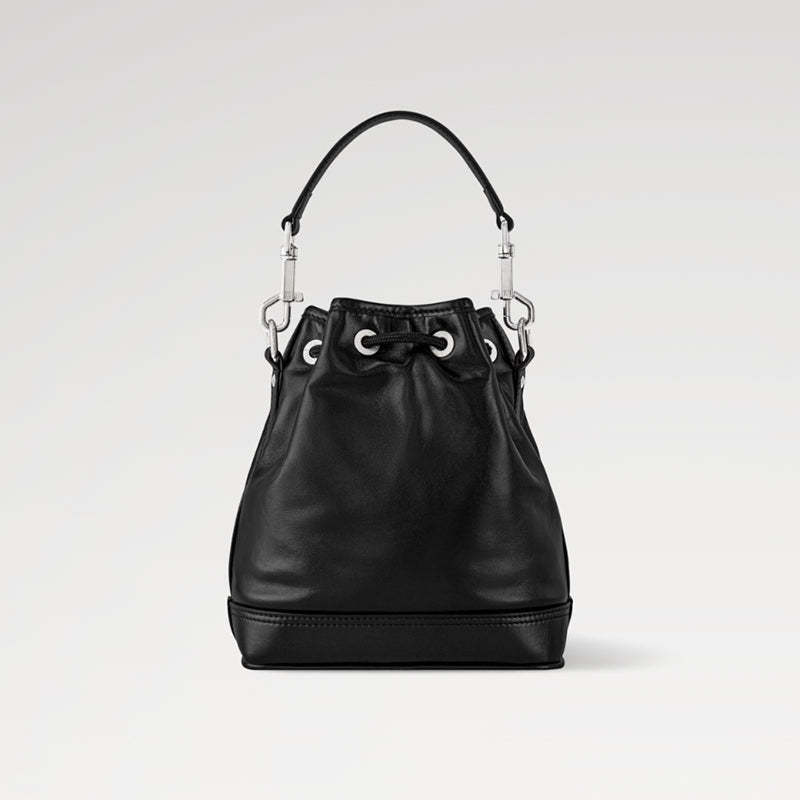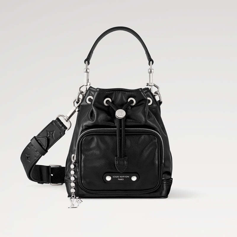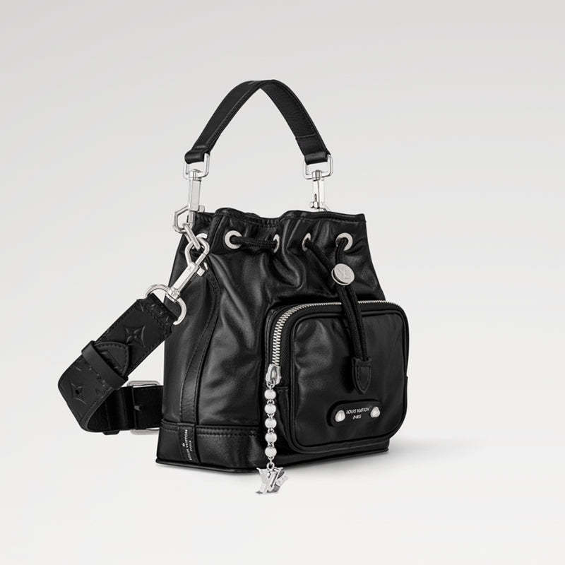 ナイロンのようなテクニカルな光沢感のある艶やかなブラックのカーフレザーで小さめのバケットスタイルに仕上げ、ブラックのテキスタイルライニングを施した「ノエ・カーゴ」。ボールチェーンに取付けられたLV イニシャルをはじめとするシルバーカラーの金具がモノトーンの外観にアクセントをプラス。広々とした容量のフロントポケットを備えたバッグです。