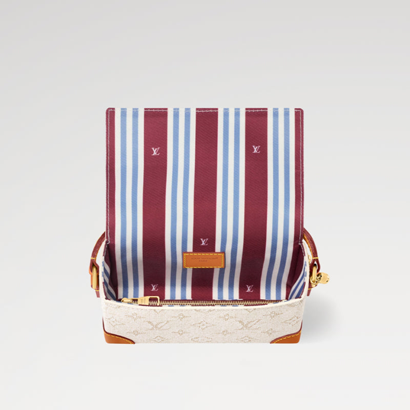 • モノグラム・ヘリテージ キャンバスに、新たな装飾的ボールチェーンと「Marque L. Vuitton Déposée」の刻印入りスクエア形パドロック(錠前)をあしらった「スティーマー・ウェアラブル ウォレット」。レザーで補強されたコーナー部分にはパドロック(錠前)と同色のリベットをあしらいました。ストライプのライニングを配した内装にはファスナー式ポケットをプラス。調節可能なストラップで肩掛けと斜め掛けの両方を楽しめます。
