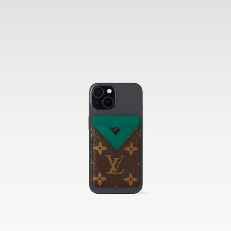 • モノグラム・マカサー キャンバスで仕立てた「ポルト カルト・マグネット」。マグネットを組み込んだデザインで、MagSafeを搭載したiPhone12以降のすべての機種に簡単に取付けられます。メゾンのアイコニックな「V」シェイプの2つのカードスロットが特徴。カラーレザーのライニングとトリミングでポップな雰囲気に仕上げました。