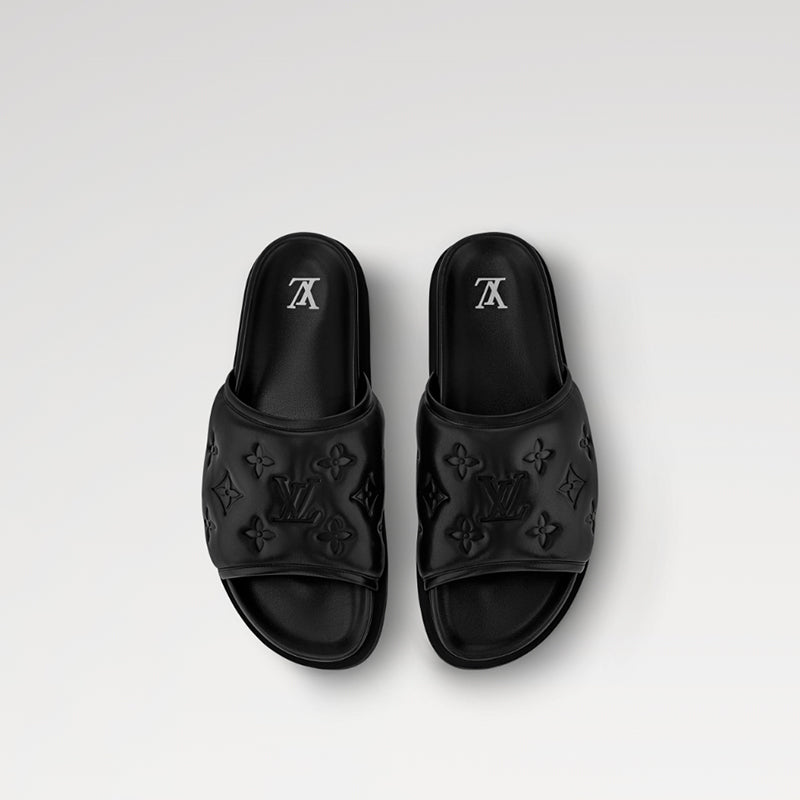 シンセティックレザーで再解釈した今シーズンの「マイアミ ミュール」。アイコニックなモノグラム・パターンをエンボス加工で施してパフ感を生み出した、幅広なパッド入りのフロントストラップが特徴です。快適なアナトミックインソールと軽量のマイクロアウトソールを配し、履き心地抜群でリラックス感のある1足に仕上げています。