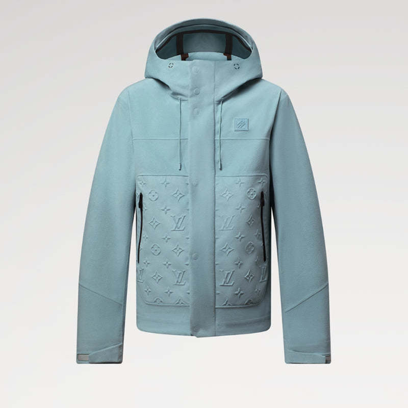 ベルベットのように滑らかなテクニカルファブリックの質感、モノグラム柄がエンボス加工された大きなジッパー付きフロントポケット、人間工学に基づいた袖口、そしてシームシール加工が施されたシームが特徴のこのジャケットは、クルーズ船のデッキでの散策に最適です。フード、裾、袖口は調節可能で、通気口が洗練された雰囲気を添えています。