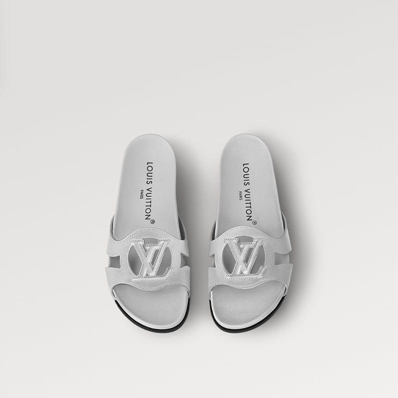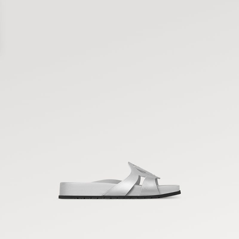 メタリックなラムスキンで作られた LV Isola スライドサンダルは、洗練されたシルエットと弾力性のあるインソール、軽量のラバーアウトソールが特徴です。アッパーのLVサークルロゴがエレガントな雰囲気を醸し出します。